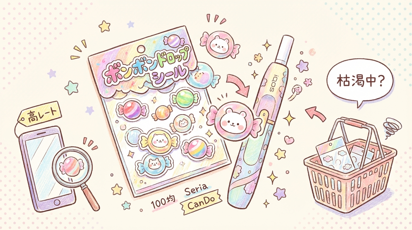 今回の「ボンボンドロップ」のようなぷっくりして厚みのあるシールは、ただ集めるだけでなく、「大人の推し活デコ(スマホケース、電子タバコ、トレカケース)」の材料として使われることがすごく多いんです。