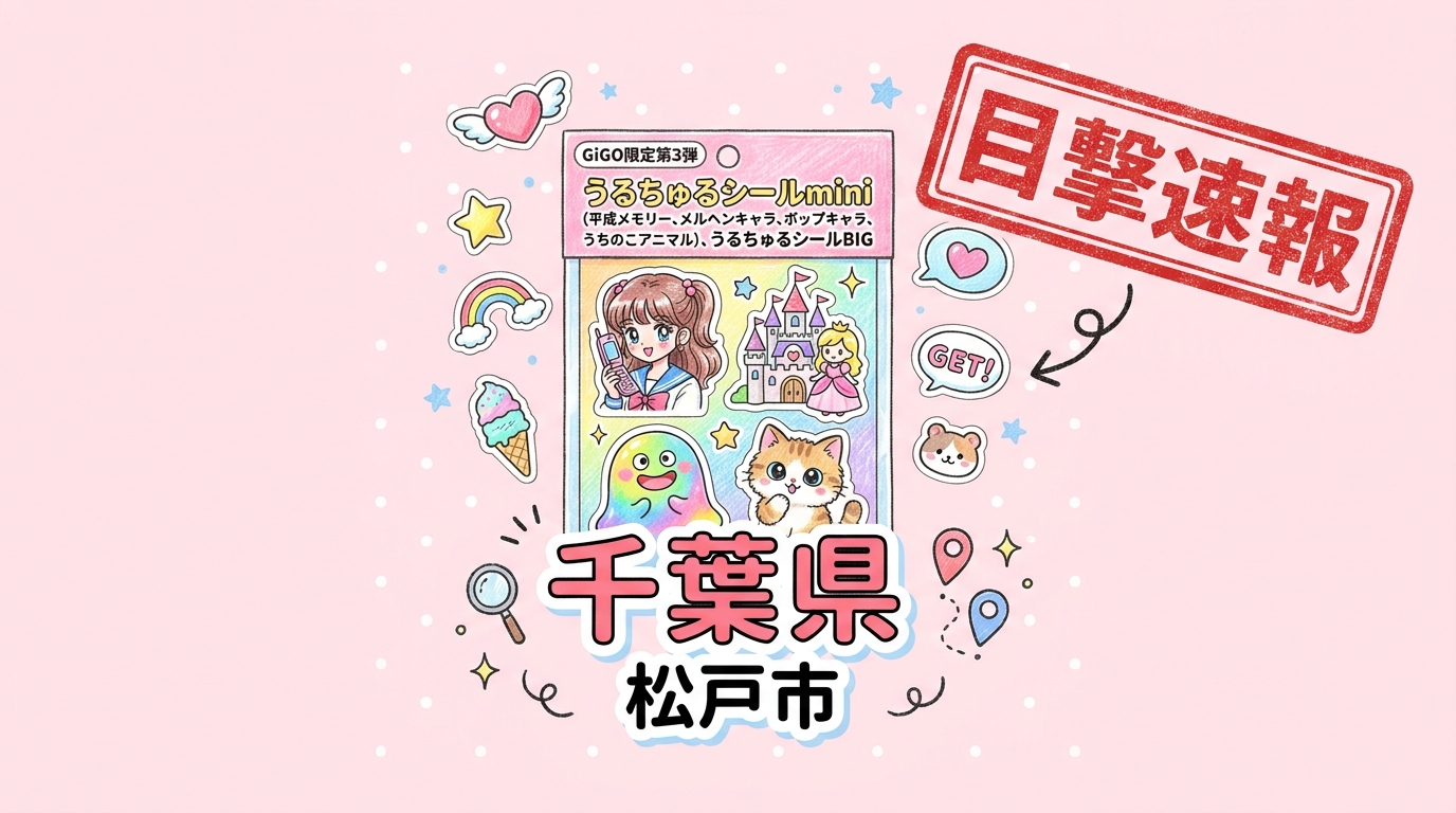 - 内容: GiGO限定第3弾 うるちゅるシールmini (平成メモリー、メルヘンキャラ、ポップキャラ、うちのこアニマル)、うるちゅるシールBIGが販売されていたとの報告あり。