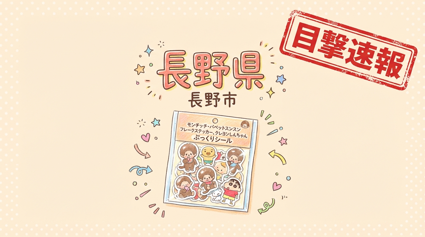 • 内容: モンチッチ・パペットスンスン フレークステッカー、クレヨンしんちゃん ぷっくりシールが販売されていたとの報告あり。