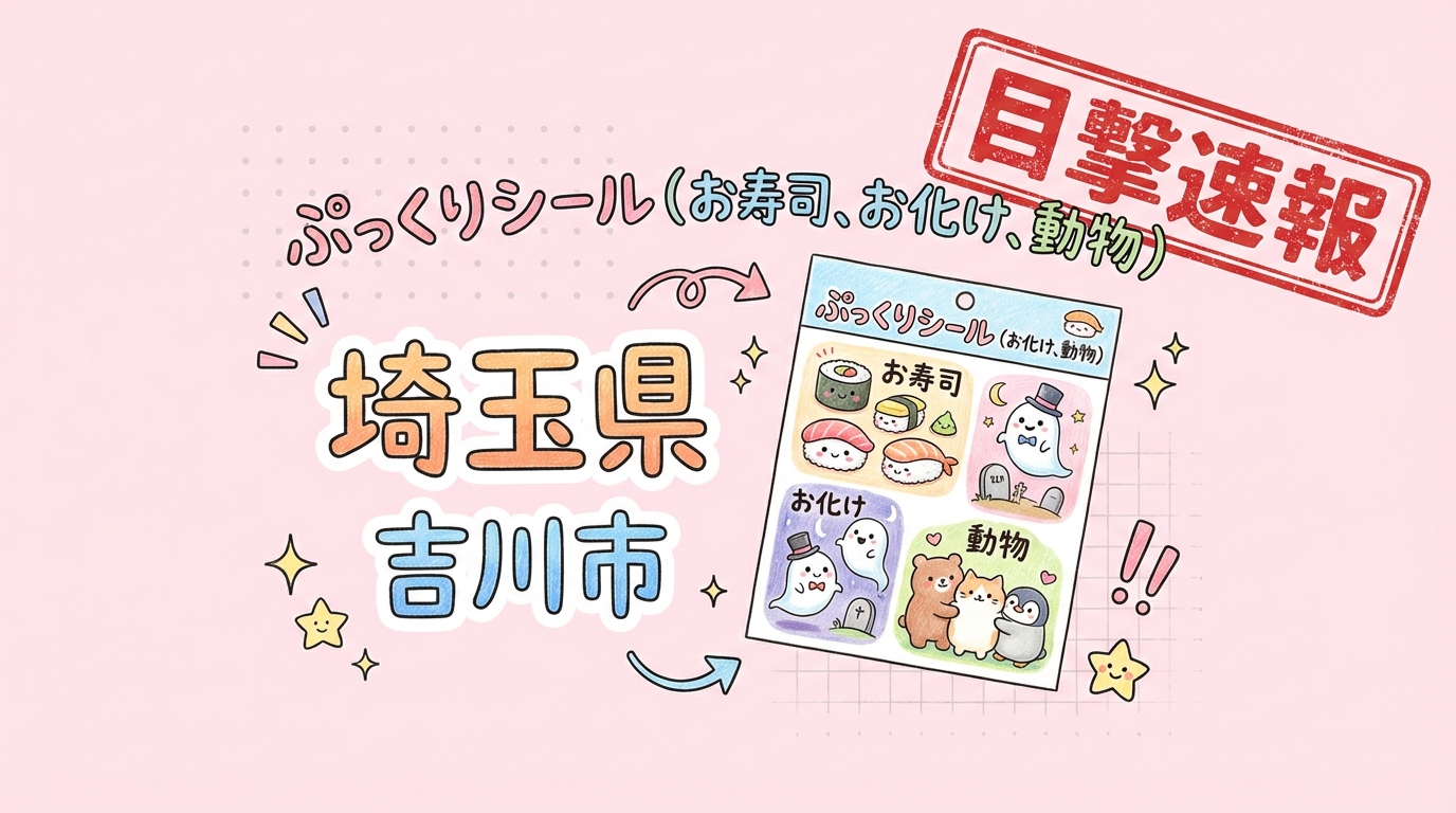 埼玉県吉川市の「バラエティーストアー カマニ」にて、ぷっくりシール(お寿司、お化け、動物)の目撃情報があります!
