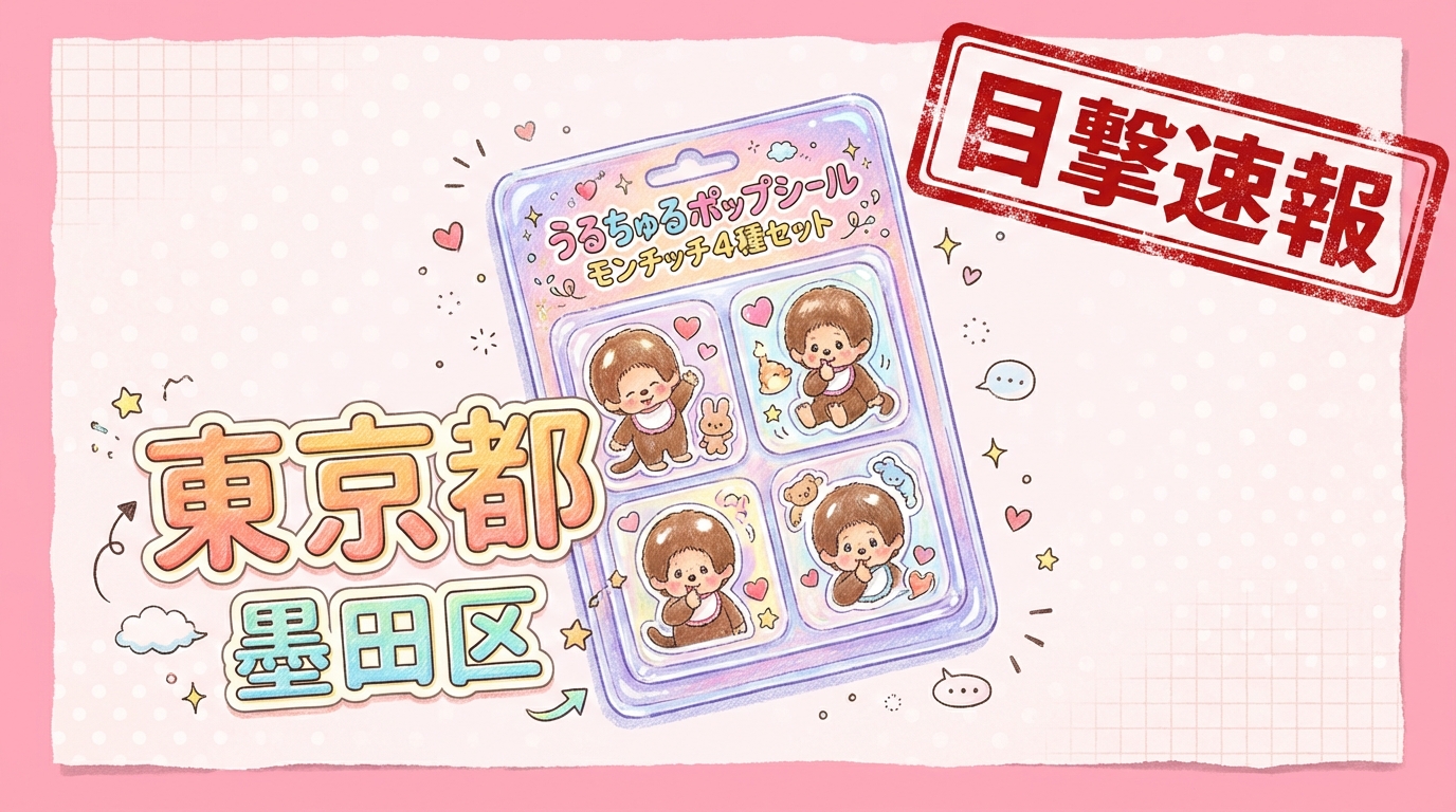 東京都墨田区の「パーティリコ 東京スカイツリータウン・ソラマチ店」にて、うるちゅるポップシール モンチッチ4種セットの目撃情報があります!