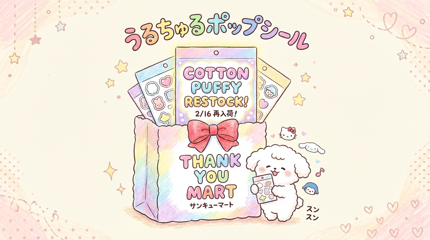 サンキューマートのような雑貨屋さんでは、シール単体だけでなく、キーホルダーやエコバッグなど「サンリオグッズ」が一斉に補充されるタイミングでお店に並ぶことが多いようです。「うるちゅるシール」などの人気シリーズも一緒に再入荷しているかもしれません。